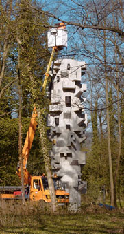 In der Gegend von Rolandswerth sind laut ökologischem Sachverständigen entlang des Flusses sechs verschiedene Arten von Fledermäusen zu finden. Es handelt sich dabei um den großen Abendsegler (Nyctalus noctula), die Wasserfledermaus (Myotis daubentoni), das Große Mausohr (Myotis myotis), die Rauhhautfledermaus (Pipistrellus nathusii), die Zwergfledermaus (Pipistrellus pipistrellus) und die Mückenfledermaus (Pipistrellus pygmäus). Da gerade in dieser Gegend die Auen-Landschaft ziemlich "ausgeräumt" ist und die Fledermäuse wegen mangelnder Nistmöglichkeiten europaweit vom Aussterben bedroht sind, erscheint es sinnvoll in den "Geheimen Gärten Rolandswerth" diesen Fledertieren Nist-und Überwinterungsquartiere anzubieten. Die dafür vorgesehenen Nisthöhlen einer auf die Bedürfnisse von Fledertieren spezialisierten Firma sind in einiger Höhe in südlicher Richtung auf dem Betonturm zwischen den Buchstaben angebracht, um den verschiedenen Arten von "Handflüglern" eine neue Heimat zu geben. Natürlich ist noch nicht gesagt, dass die Tiere die Brutplätze annehmen werden. Aber mit einem vielschichtigen Nist-Angebot wurden optimale Bedingungen geschaffen, um oben beschriebenes Bild des fledermausumkreisten Turmes zu erzeugen.